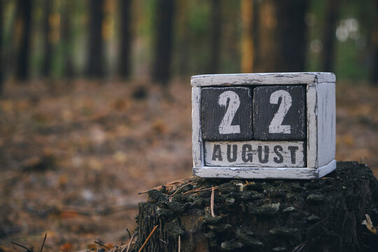 August 22 summer month, wooden calendar with date and month in forest.Flag Day of Russia.