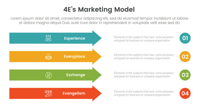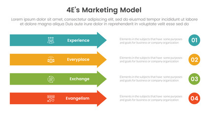 4E marketing model infographic 4 point stage template with rectangle arrow right direction vertical stack for slide presentation