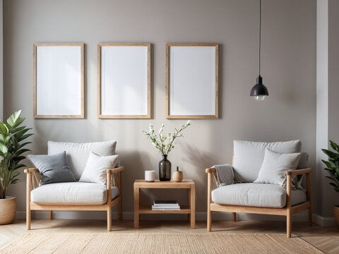 Blank DIN A Wooden Vertical 3 Set of PSD Frame Mockup, Minimalist Scandinavian Interior Living room Background