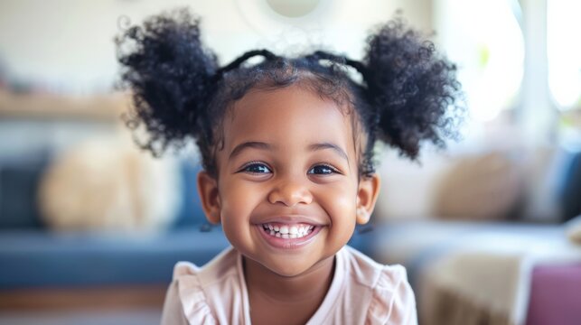 Smiling cute little African American girl with two pony tails looking at camera. Portrait of happy female child at home. Smiling face a of black 4 year old girl looking at camera with afro puff hair.