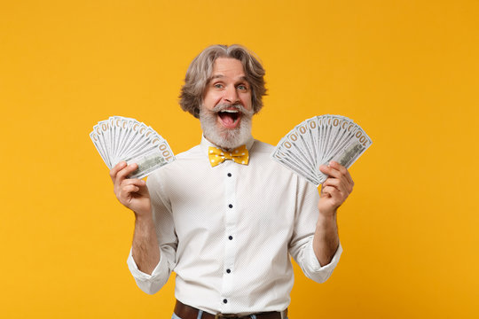 Excited elderly gray-haired mustache bearded man in white shirt bow tie isolated on yellow orange background. People lifestyle concept. Mock up copy space. Hold fan of cash money in dollar banknotes.