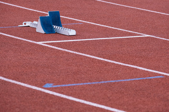 Starting blocks with spikes at the 400m start line with a baton