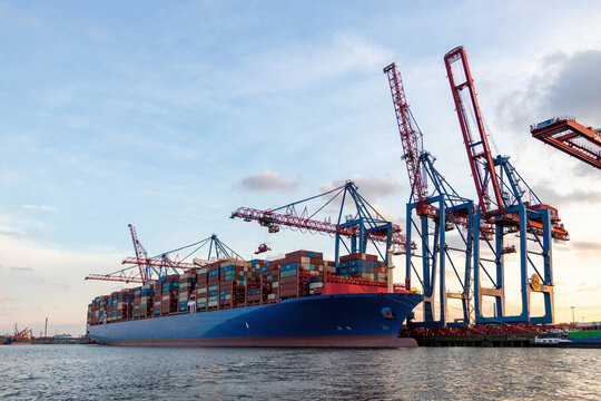 Huge container ship in the harbour of Hamburg, 400m long, sunset shot.