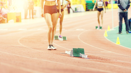 Sportswoman standing near starting blocks before sprint running event
