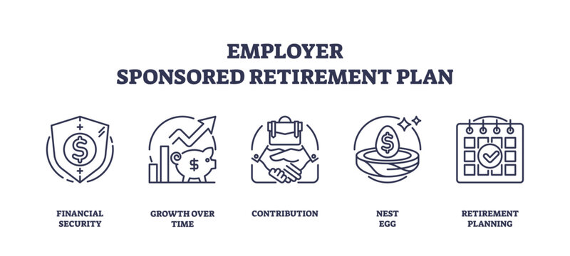Outline icons representing financial security, growth over time, contribution, nest egg, and retirement planning, outline icons set.