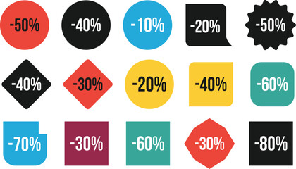 Colorful discount percentage badge icon collection – vector sale tags for 10% to 80% off, perfect for ecommerce, promotional banners, seasonal offers, and marketing design.