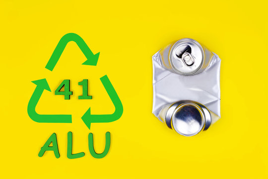 Compressed aluminum metal reusable tin cans bottle and recycling sign symbol with code alu 41 Nature pollution contamination, ecology environmental problem damage concept Yellow background. Zero waste