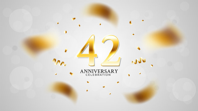 42nd golden anniversary logo with gold ring and golden ribbon, vector design for birthday celebration, invitation card.