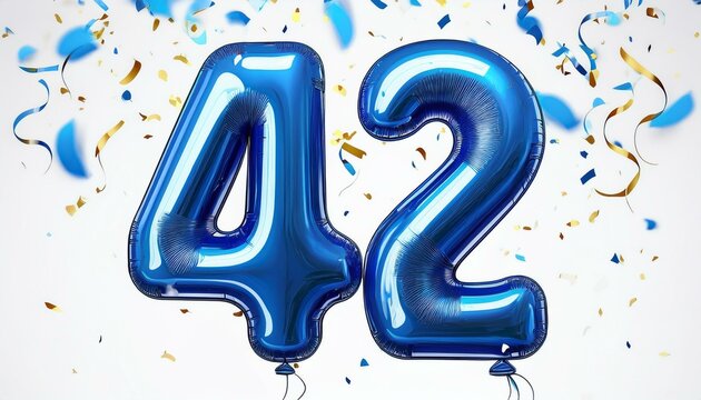 Blue birthday / anniversary balloon, number 42, white background with confetti