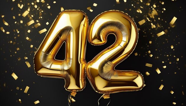 Gold birthday / anniversary balloon, number 42, black background with confetti