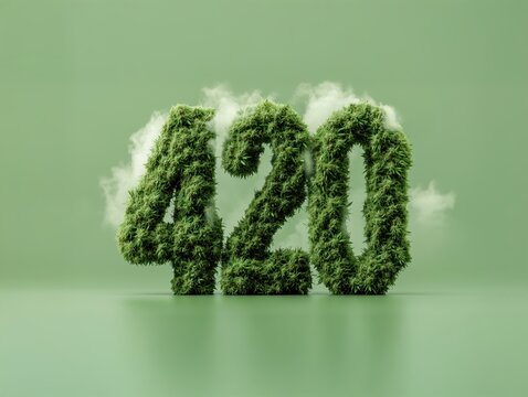 420 Typography with Cannabis Buds Surrounded by Smoke on a Clean Green Background Representing Modern Cannabis Culture