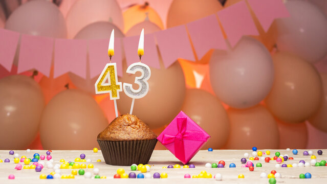 Decorations with balloons and a happy birthday candle with the number 43 for a woman. Happy birthday greetings in pink flowers for forty-three years old for an adult girl, copy space. Muffin