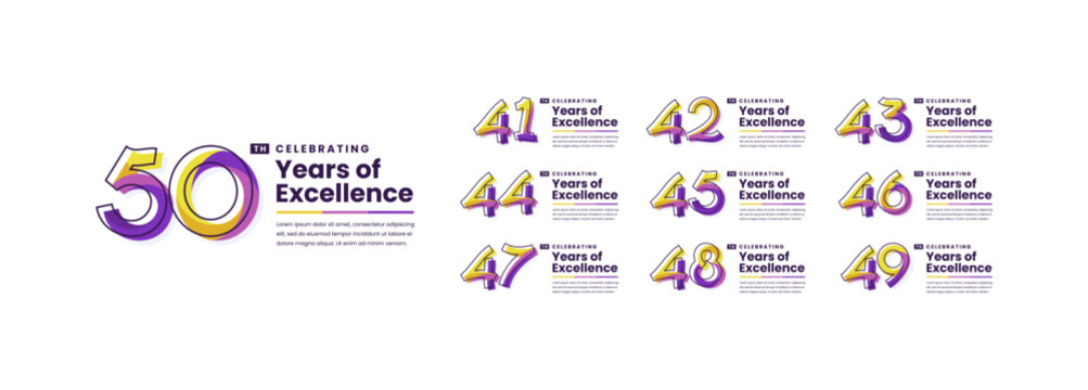 Colorful Years of Excellence Anniversary Logotype Set. 41, 42, 43, 44, 45, 46, 47, 48, 49, 50