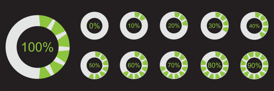 Percentage infographics elements. Green, grey color fill pie charts indicator template. Round diagrams icons for infographics from 0 to 100 percent collection. Set of circle graph loading progress.
