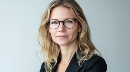 Confident 45 year old Latin professional mid aged business woman corporate leader, mature female executive manager wearing eyeglasses standing looking at camera, portrait.