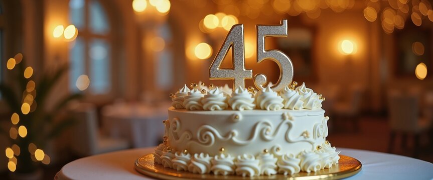 Elegant golden 45th birthday cake with swirls in festive setting, anniversary celebration