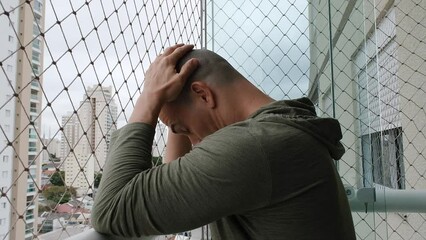 48 year old Brazilian, worried, rubbing his head on the balcony.