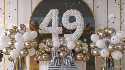 Birthday cake with candles and balloons, celebrating 49th birthday.