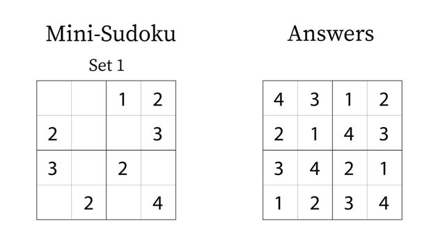 Mini Sudoku Puzzle 4x4 Set 5 for Kids Easy with Answers, Fun Brain Training Math Game for Kids, Vector