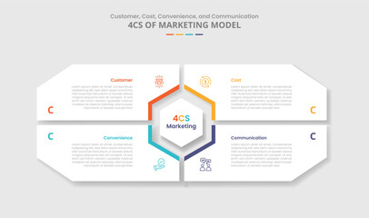 4c marketing model for infographic with drop shadow style with big matrix shape with hexagon center with 4 point list information