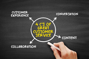4 C's of great customer service (assistance and advice provided by a company to those people who buy or use its products or services) mind map text concept background