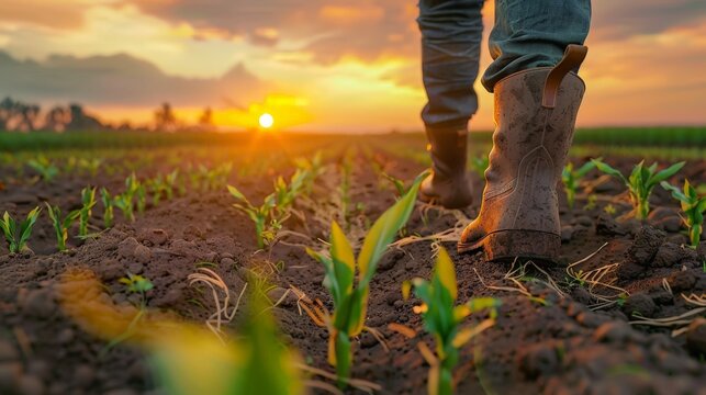 Generative AI captures the sharp detail of a farmer's boots as they walk away from the camera in a field of sprouting corn.