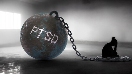 Ptsd - a metaphorical view of a woman struggle with ptsd. Trapped alone and chained to a burden of Ptsd. Constant and strenuous fight.,3d illustration