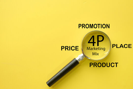 Magnifying glass focusing on 4P Marketing Mix: Product, Price, Place, Promotion.concept for market analysis,Strategic business planning,market research,business development.