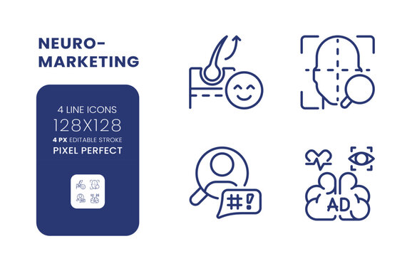 Neuromarketing linear desktop icons set. Marketing research. Customers preferences. Pixel perfect 128x128, outline 4px. Isolated user interface elements pack for website. Editable stroke