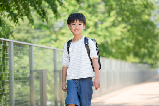 Short-sleeved elementary school boy carrying his school bag in the fresh green, looking at the camera