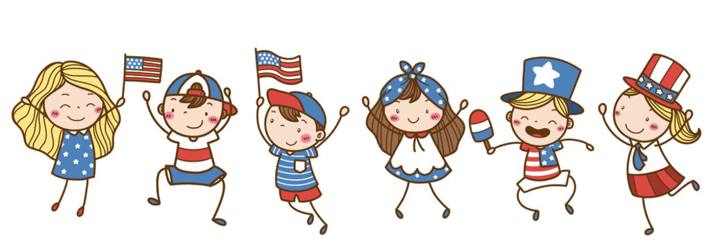 4th July, doodle icon set. USA Style Vector illustration collection. America Banner Hand drawn Line art style.