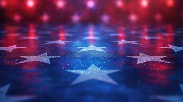 Sparkling blue and red stars on reflective floor with soft glowing lights in the background. Election day, festive decor, celebration, American holidays, political events, 4th of July concept.