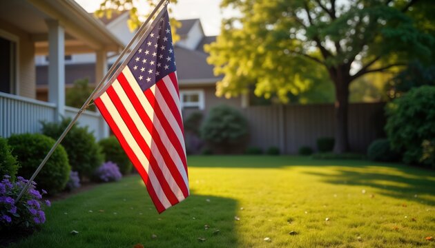 Patriotic US flag in a home backyard. American flag waving in the garden of a house. Daytime scene. Residential property. Patriotism displayed. Holiday vibes. Nice day outdoors.