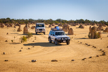 A 4x4 camper equipped with a roof tent crosses a sand dune of the Admer erg in the heart of the Algerian Sahara desert