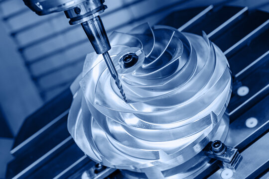 Five axis CNC machining center cutting engine turbine, blue toning. Concept modern technology for industry