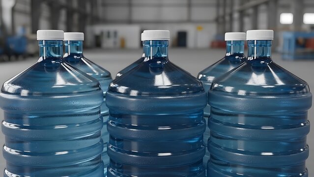 A close-up view of multiple large blue water bottles in a warehouse setting. 5 gallon water jug clean drinking water concept for marketing materials