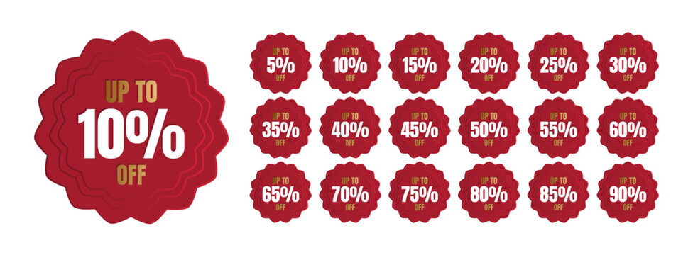 Set of red flower shaped discount tags with gradient. Words in gold. Up to 5, 10, 15, 20, 25, 30, 35, 40, 45, 50, 55, 60, 65, 70, 75, 80, 85, 90 percent off.