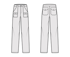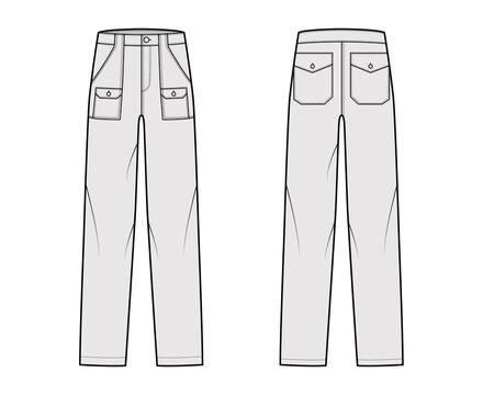 Bush pants Denim pants technical fashion illustration with low waist, rise, patch bellows cargo pockets, full lengths. Flat bottom template front back, grey color style. Women, men, unisex CAD mockup