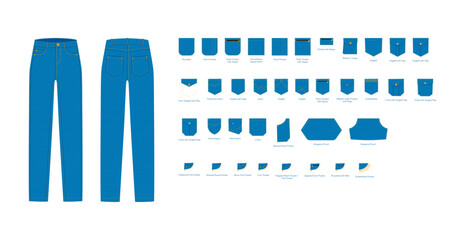 Set of Jeans with pockets - Denim technical fashion illustration with Patch, Rounded, traditional Kangaroo angled 5, Rivets. Flat blue bottom template front, back, grey color style. CAD mockup