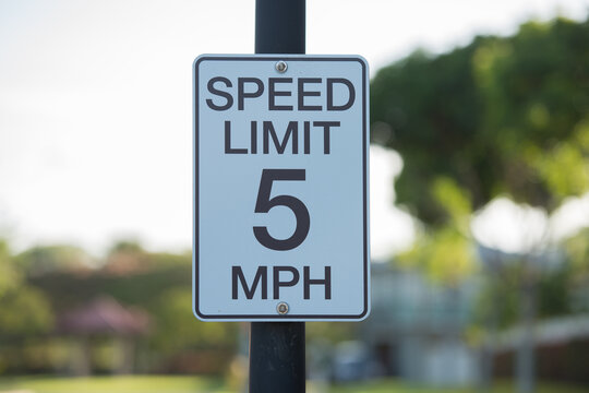 5 mph sign painted on road surface. Slow 5 mph speed limit sign in restriction area.
