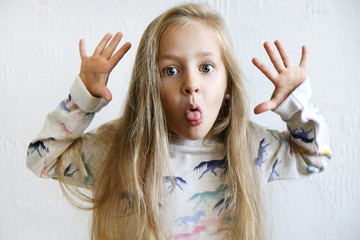 Little blonde girl with long golden hair dancing, smling and having fun over white textured plaster wall background. Five years old blonde female child posing. Copy space for text.