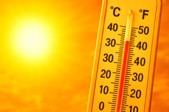 Scorching Summer Heatwave: A Simple Composition in Orange Hues Illustrating Extreme Temperatures in °C and °F, Reaching Up to 50°C and Beyond, Ideal for Visualizing Summer's Intense Heat.