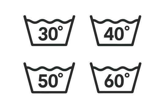 Washing temperature symbols, 30, 40, 50, 60 degrees. Set of laundry care label icons. Machine wash instruction for clothes. Textile care properties. Vector pictogram illustration.