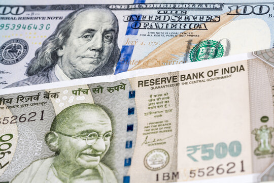 100 US dollar and 500 Indian rupee banknotes. International trade concept