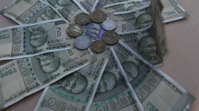 Indian currency notes of various denominations. Indian five hundred rupees note with other denominations in background.