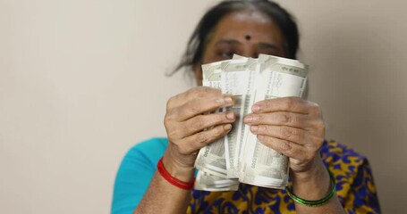 Indian woman counting new Indian 500 rupee notes against white wall at home. Plan on a monthly budget. Indian Rupee, Home Finance concept.