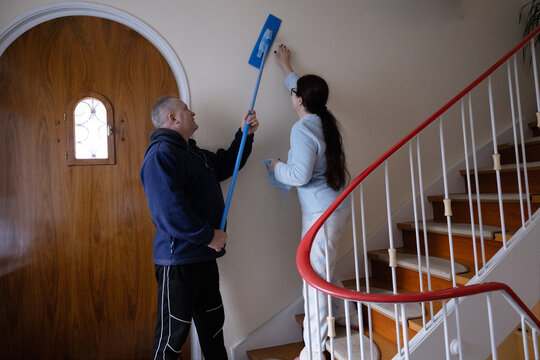A 50 years old man cleaning his house's hall and stairs.