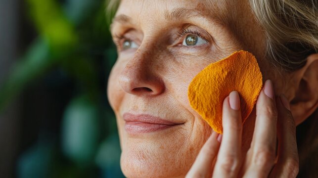 Mature woman massaging her cheek with a turmeric-soaked cotton pad