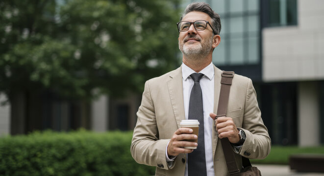 Smiling 50years Businessman with Coffee and Messenger Bag Walking Outdoors Near Office, Selective focus
