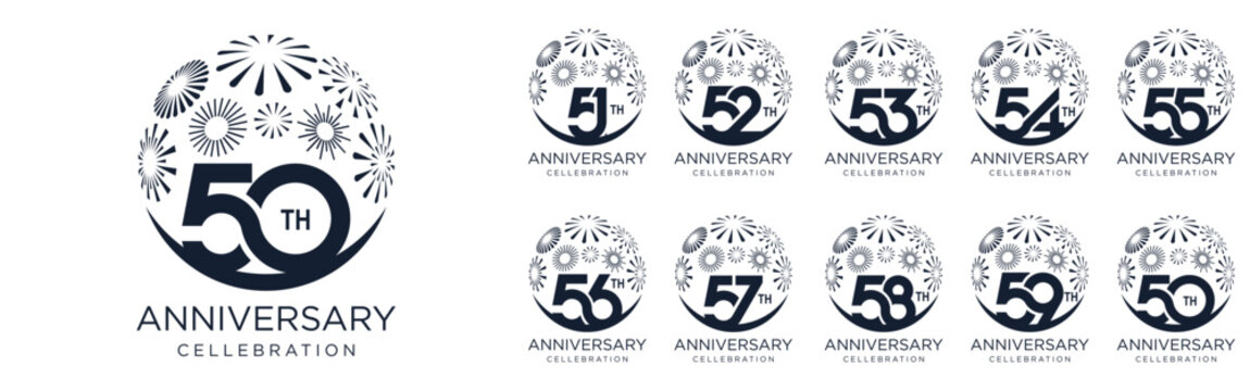 set of 50 to 59th anniversary logotype design, with black color fireworks for celebration event, wedding, and birthday, vector illustration